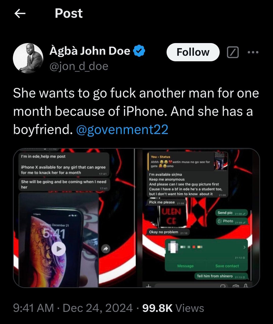 A leaked chat has taken the internet by storm, exposing a lady expressing her readiness to engage in intimacy with a man for a month in exchange for an iPhone X.
