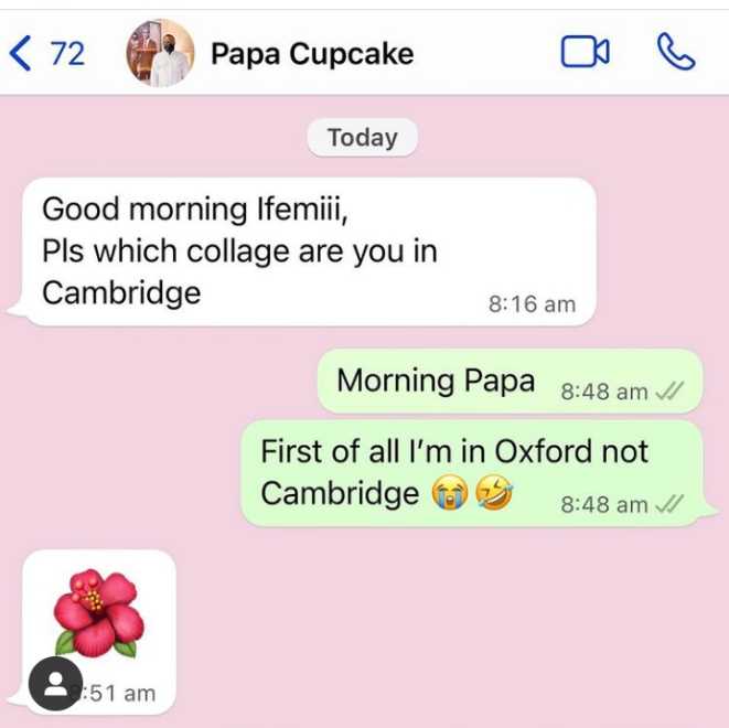 Femi Otedola had asked Cuppy about her university, “Cambridge”, and Cuppy in her response, told him that she doesn’t attend Cambridge.