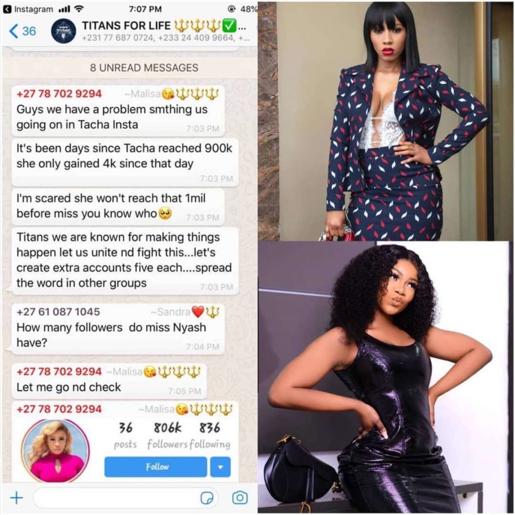 A leaked whatsapp message from a Titan Whatsapp group showed members of plotting to open 5 IG accounts each to follow Tacha and make sure she hits 1M before Mercy.