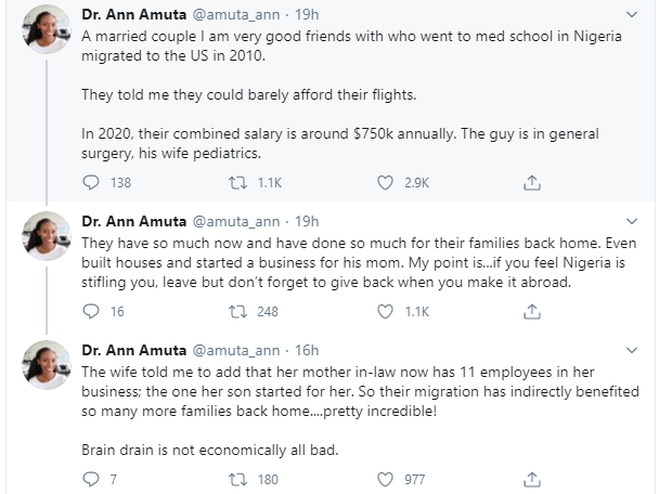 “A married couple I am very good friends with who went to med school in Nigeria migrated to the US in 2010. They told me they could barely afford their flights. In 2020, their combined salary is around $750k annually. The guy is in general surgery, his wife pediatrics.