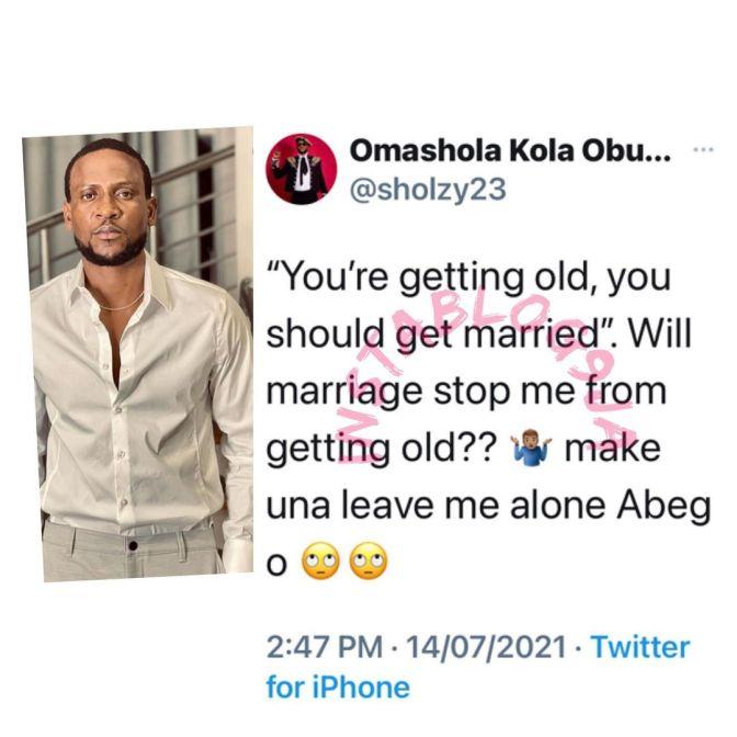 This comes as Omashola took to his Twitter account to make this known while he was also dropped a message for those asking him to get married.