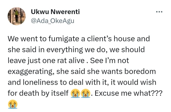 She wrote: “We went to fumigate a client’s house and she said in everything we do, we should leave just one rat alive. See I’m not exaggerating, she said she wants boredom and loneliness to deal with it, it would wish for death by itself. Excuse me what???”