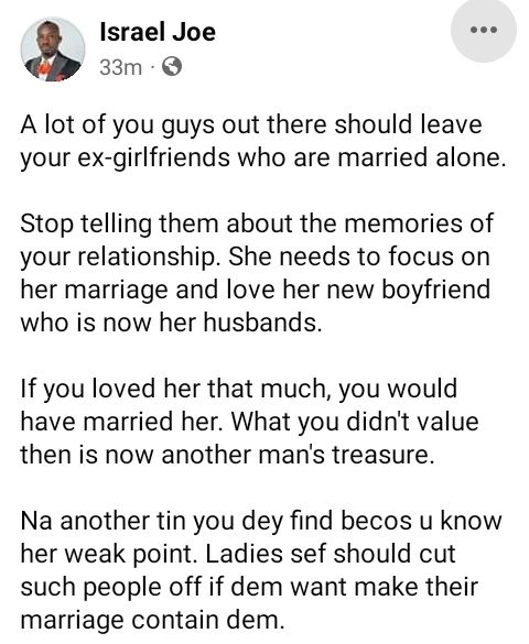Popular activist, Israel Joe advises men to leave their married ex girlfriends alone so they can focus on their marriage.