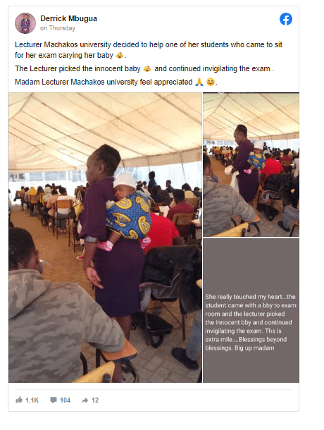 “The lecturer picked up the innocent baby and continued invigilating the exam. This is extra mile…blessings beyond blessings, big up madam,” Mbugua wrote on Facebook.