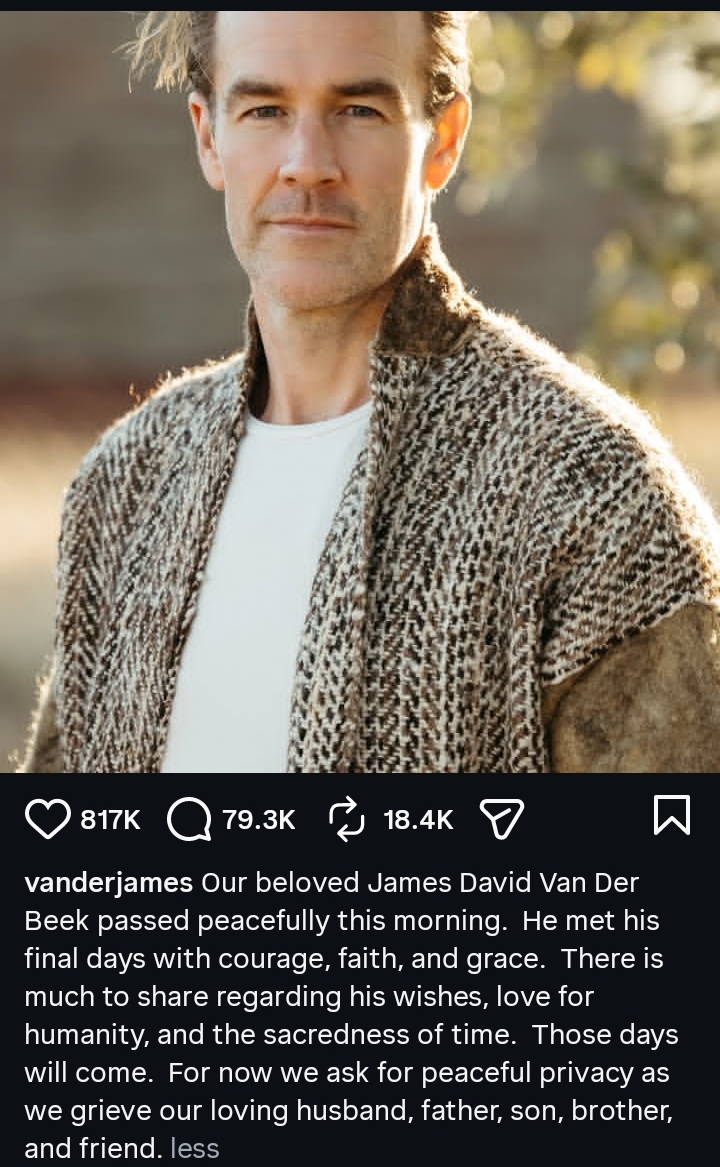 ”Our beloved James David Han passed peacefully this morning. He met his final days with courage faith and grace.There is much to share regarding his wishes, love for humanity and the sacrifices of time.Thoes days will come. For now, we ask for peaceful privacy as we grieve our husband, father , son , brother and friend”, The post reads.