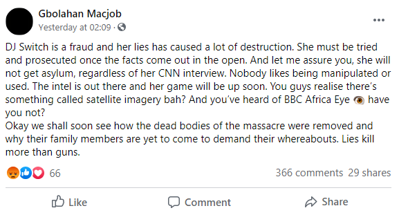 ”DJ Switch is a fraud and her lies has caused a lot of destruction. She must be tried and prosecuted once the facts come out in the open. And let me assure you, she will not get asylum, regardless of her CNN interview. Nobody likes being manipulated or used. The intel is out there and her game will be up soon. You guys realise there’s something called satellite imagery bah? And you’ve heard of BBC Africa Eye ? have you not?
