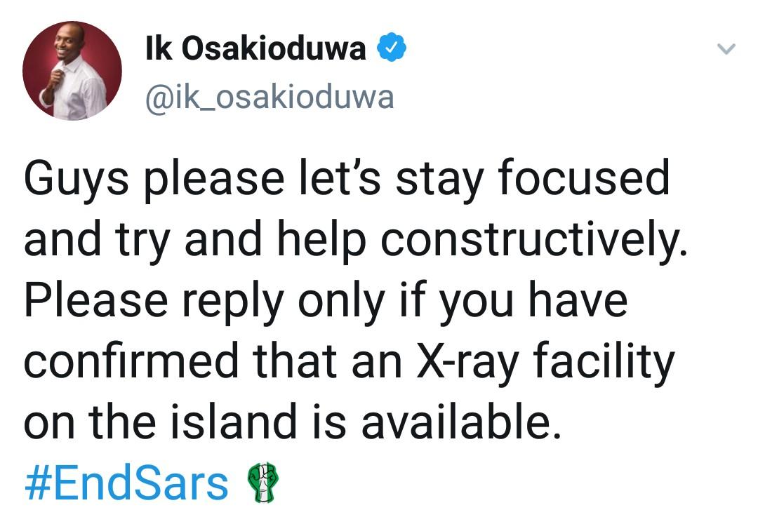 Guys please let’s stay focused and try and help constructively. Please reply only if you have confirmed that an X-ray facility on the island is available. #EndSars”