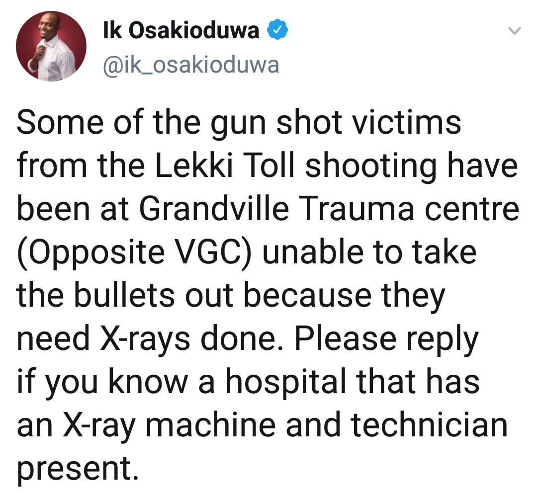 Media personality, IK Osakioduwa has disclosed that some of the gunshot victims from the Lekki toll gate shooting have been unable to take the bullets out because they need x-rays done.