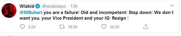 In reaction, Wizkid stated that Buhari has failed in his duty as the president of the country, adding that he should step down, including Osinbajo and Adamu.