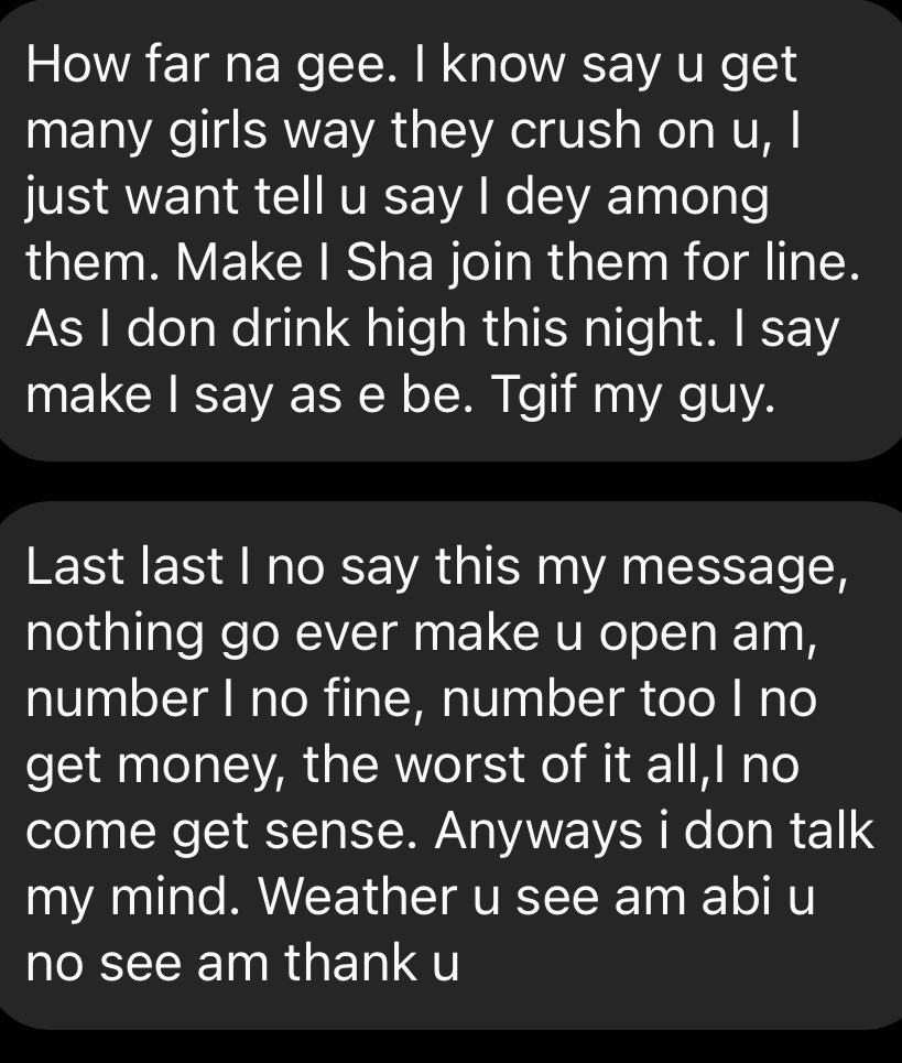 The chat reads in part, “How far na gee. I know say u get many girls way they crush on u, I just want tell u say I dey among them. Make I Sha join them for line. As I don drink high this night. I say make I say as e be. Tgif my guy.