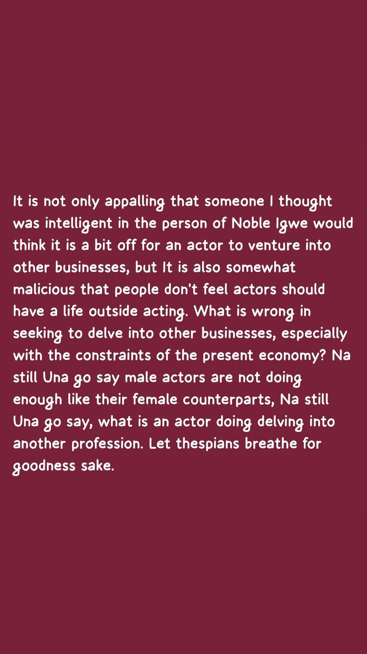 In his words: “It is not only appalling that someone I thought was intelligent in the person of Noble Igwe would think it is a bit off for an actor to venture into other businesses, but It is also somewhat malicious that people don’t feel actors should have a life outside acting. What is wrong in seeking to delve into other businesses, especially with the constraints of the present economy? Na still Una go say male actors are not doing enough like their female counterparts, Na still Una go say, what is an actor doing delving into another profession. Let thespians breathe for goodness sake.”