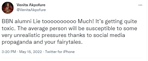 Following this announcement made by Ifu Ennada, Venita Akpofure took to her Twitter handle to drop a shady post where she called out ex-BBN housemates for lying.
