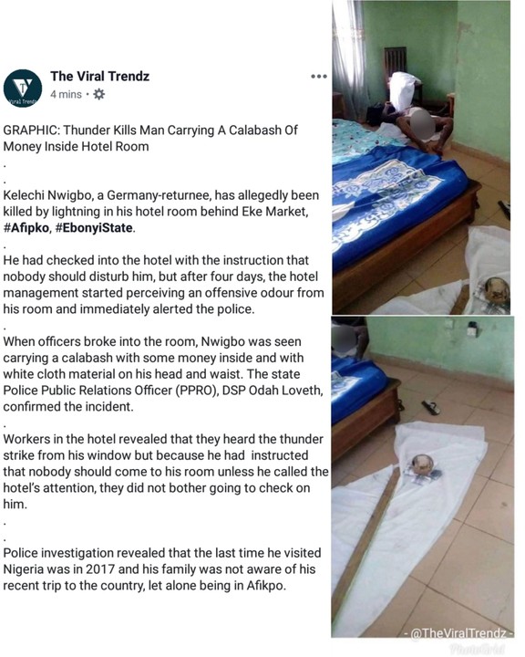 Kelechi Nwigbo, a Germany-returnee, has allegedly been killed by lightning in his hotel room behind Eke Market, Afipko, Ebonyi State.