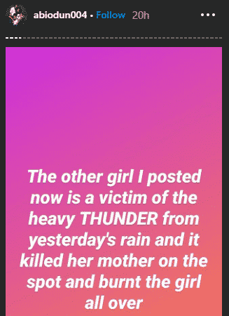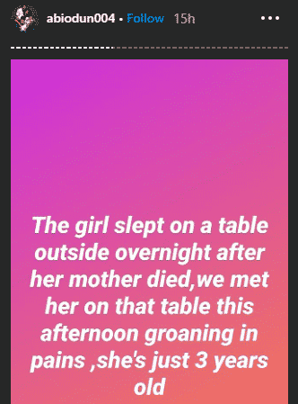 “The girl slept on a table outside overnight after her mother died,” Abiodun wrote, adding: “We met her on that table this afternoon groaning in pains. She’s just 3-years-old.”