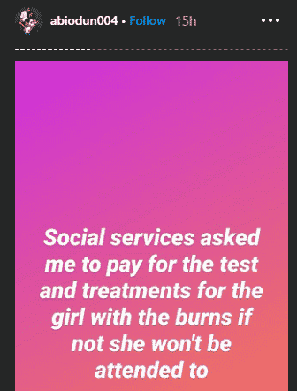 “Social services asked me to pay for the test and treatments for the girl with the burns if not she won’t be attended to.”