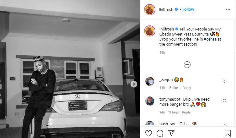 In a recent post via Instagram, Lil Frosh showed off his newly acquired Benz in a black & white image filter.