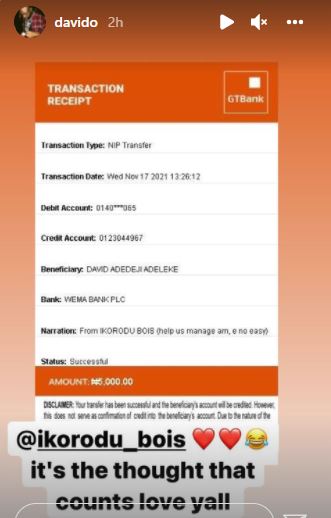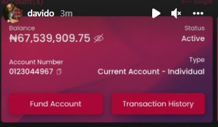 Davido who has gotten over N67M under three hours received 5000 naira as the least donation and over N1.5M from individual celebrities.