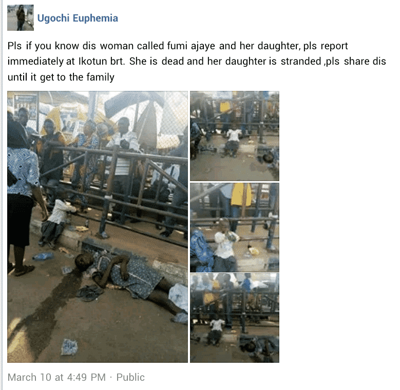 “Pls if you know dis woman called fumi ajaye and her daughter, pls report immediately at Ikotun brt. She is dead and her daughter is stranded ,pls share dis until it get to the family” Ugochi wrote on Facebook.