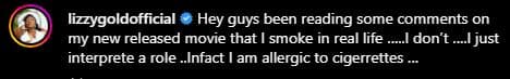 Addressing the issue on her Instagram page, Lizzy Gold disclosed that she is not a chronic smoker nor smokes in real life as people assume. She further disclosed that she has a cigarette allergy.