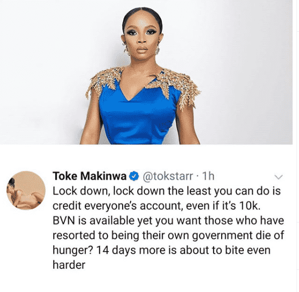 Lockdown: ‘Credit everyone’s account even if it’s N10k’ – Toke Makinwa tells FG