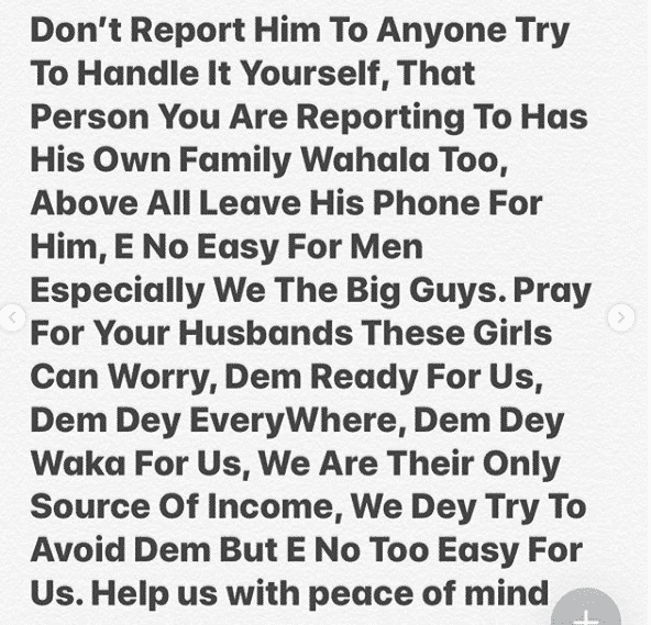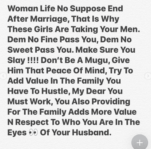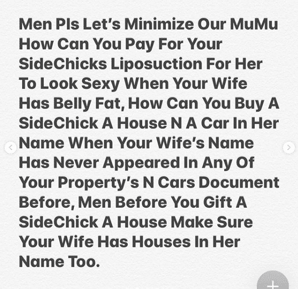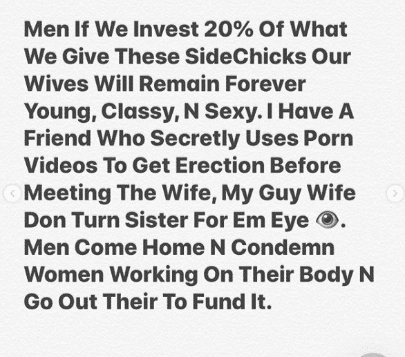 The nightlife entrepreneur also averred that if men invest 20 percent of what they give to the side chicks in their wives, they will remain sexy and classy.