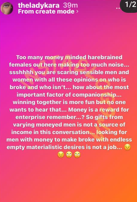 “Too many money minded harebrained females out here making too much noise… ssshhhh you are scaring sensible men and women with all these opinions on who is broke and who isn’t… how about the most important factor of companionship… winning together is more fun but no one wants to hear that… Money is a reward for enterprise remember…? So gifts from varying moneyed men is not a source of income in this conversation… looking for men with money to make broke with endless empty materialistic desires is not a job… ”