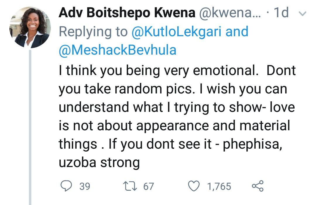 “I think you being very emotional. Dont you take random pics. I wish you can understand what I trying to show- love is not about appearance and material things.”
