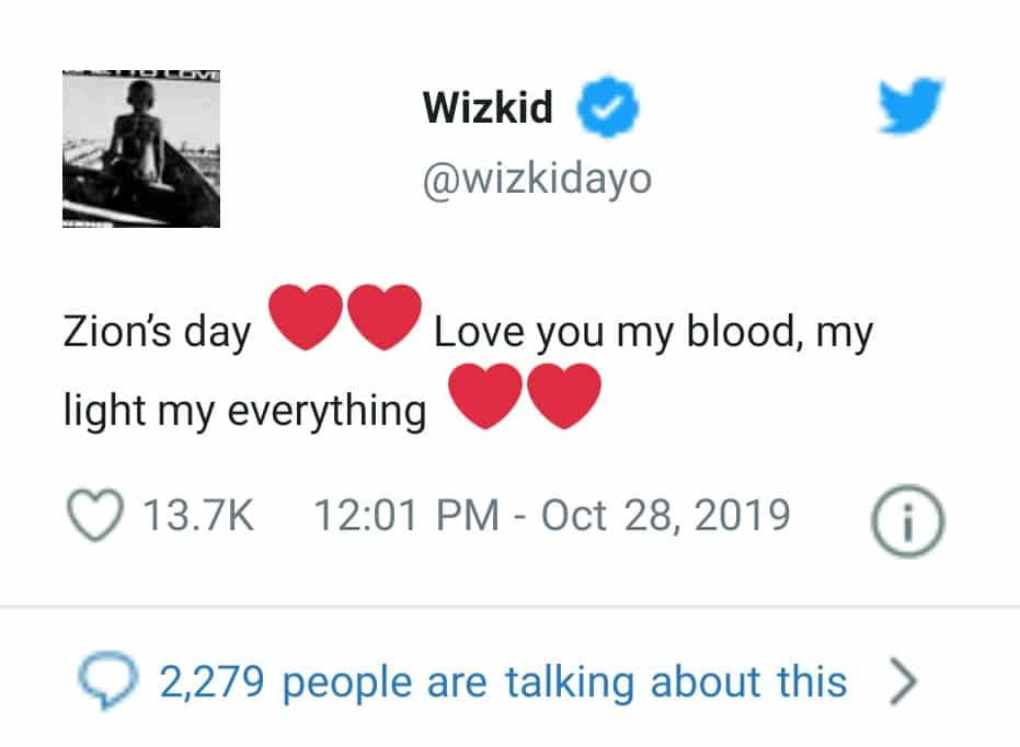 Wizkid who seems to be taking a break after after rounding up an amazingly-successful festival; Starboy Fest took to his Twitter page to declare his enormous love for Zion as he wishes him a happy birthday.