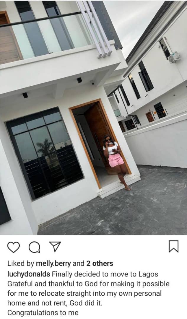 She wrote: “Finally decided to move to Lagos. Grateful and thankful to God for making it possible for me to relocate straight into my own personal home and not rent, God did it. Congratulations to me”