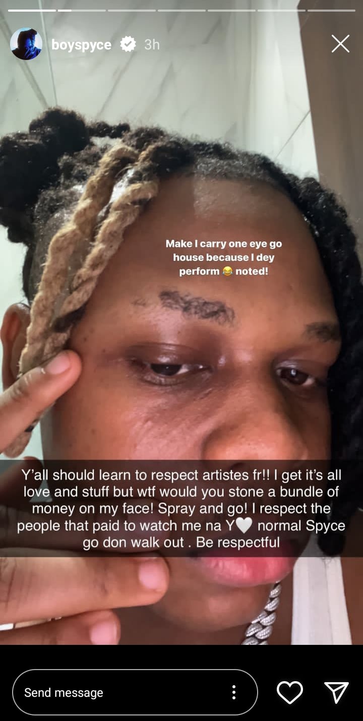 “Make I carry one eye go house because I dey, perform, noted! Y’all should learn to respect artistes fr!! I get it’s all love and stuff but wtf would you stone a bundle of money on my face! Spray and go! I respect the people that paid to watch me na YY normal Spyce go don walk out . Be respectful”
