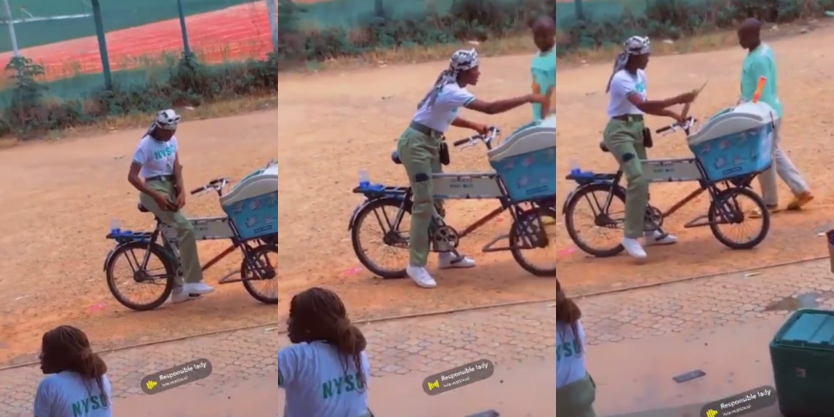“Make I fit chop” – Corper says as she rides ice-cream bicycle