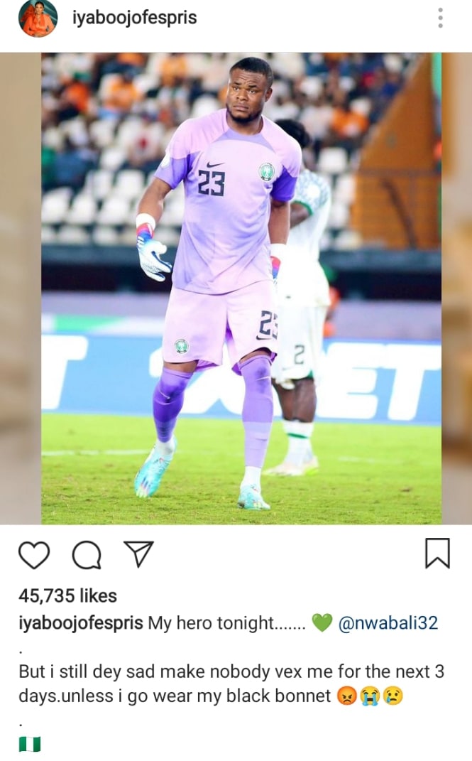 She wrote: “My hero tonight……. 💚 @nwabali32 But i still dey sad make nobody vex me for the next 3 days.unless i go wear my black bonnet 😡😭😢 🇳🇬”