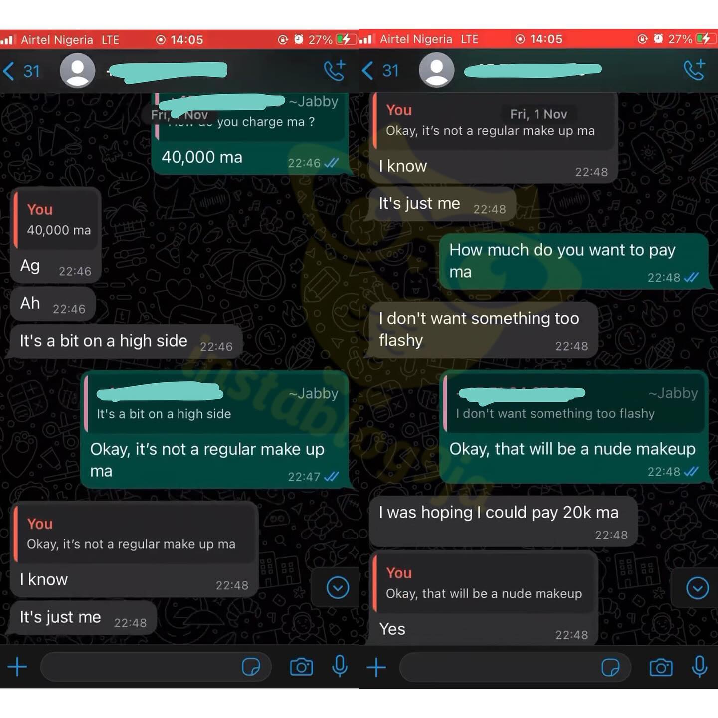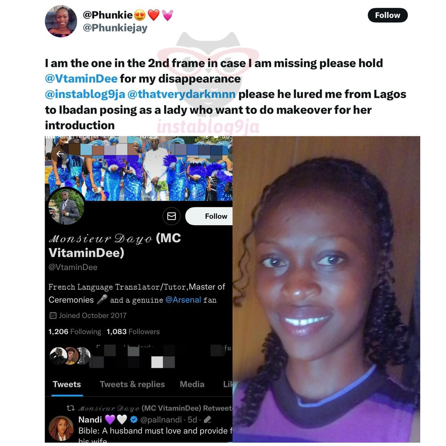 A Nigerian makeup artist has taken to social media to seek help after a disturbing incident involving her ex-boyfriend posing as a man to lure her to Ibadan for a makeover.