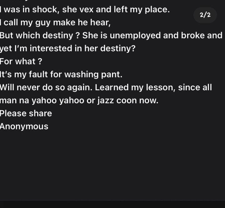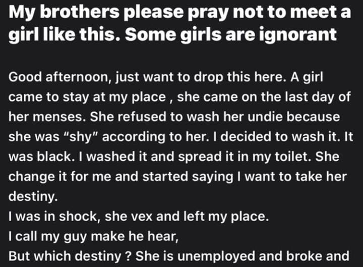 “A girl came to stay at my place, she came on the last day of her menses. She refused to wash her undie because she was “shy” according to her. I decided to wash it. It was black. I washed it and spread it in my toilet. She changed it for me and started saying I want to take her destiny. I was in shock, she vex and left my place. I call my guy make he hear, But which destiny? She is unemployed and broke and was in shock, she vex and left my place. I call my guy make him hear me out, but which destiny? She is unemployed and broke and et I’m interested in her destiny? for what? it’s my fault for washing pants. I’ll never do so again. Learned my lesson, since all man na yahoo yahoo or jazz coon now.
