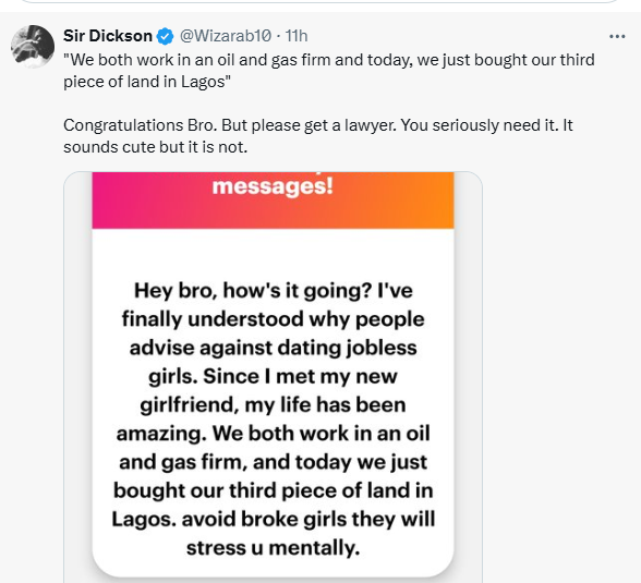 and gas firm, and today we just bought our third piece of land in Lagos. avoid broke girls they will stress u mentally.”