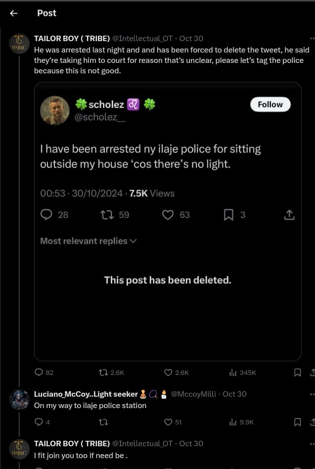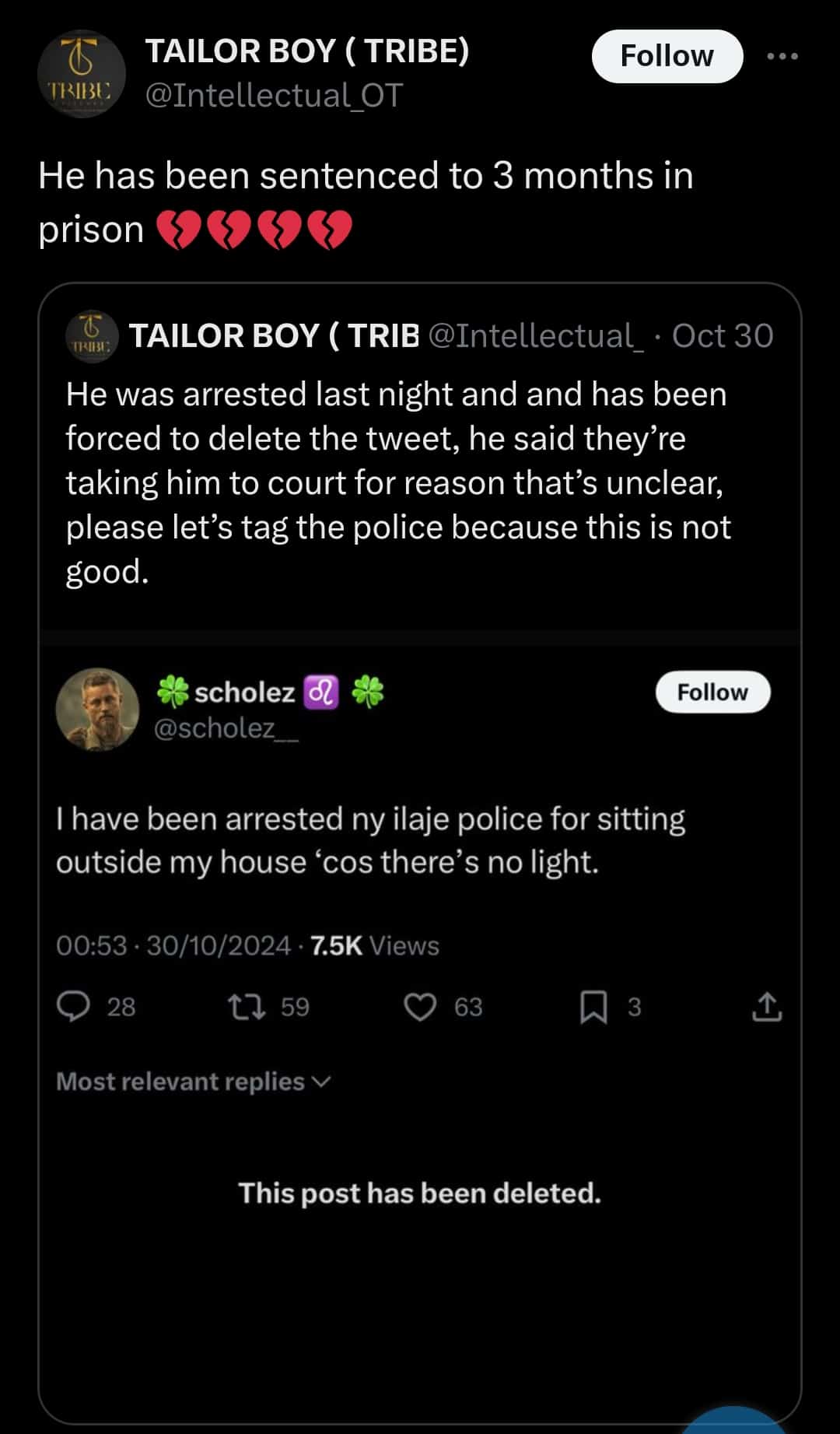 In a subsequent update, the follower reported, “He was arrested last night and has been forced to delete the tweet. They’re taking him to court for reasons that are unclear. Please let’s tag the police because this is not good,” indicating that the man was pressured to remove the tweet.