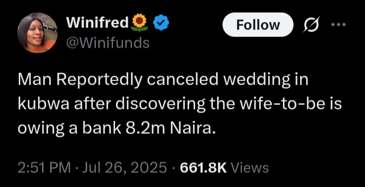 “Man Reportedly canceled wedding in kubwa after discovering the wife-to-be is owing a bank 8.2m Naira.”