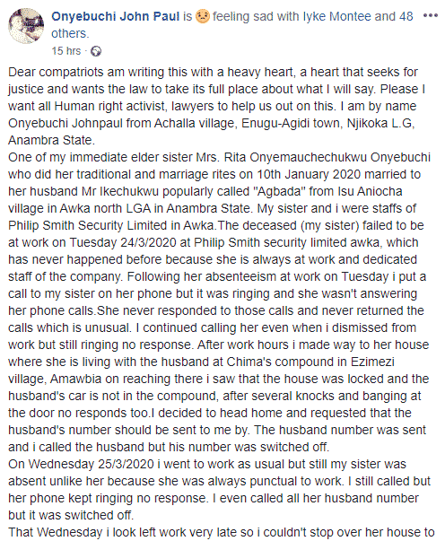 One of my immediate elder sister Mrs. Rita Onyemauchechukwu Onyebuchi who did her traditional and marriage rites on 10th January 2020 married to her husband Mr Ikechukwu popularly called “Agbada” from Isu Aniocha village in Awka north LGA in Anambra State. My sister and i were staffs of Philip Smith Security Limited in Awka.The deceased (my sister) failed to be at work on Tuesday 24/3/2020 at Philip Smith security limited awka, which has never happened before because she is always at work and dedicated staff of the company. Following her absenteeism at work on Tuesday i put a call to my sister on her phone but it was ringing and she wasn’t answering her phone calls.She never responded to those calls and never returned the calls which is unusual. I continued calling her even when i dismissed from work but still ringing no response.