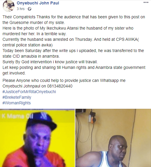 He also revealed that the husband was arrested on Thursday, March 26 and held at Central Police Station Awka. On Saturday, March 28, he was transferred to the state CID Amaubia, Anambra.