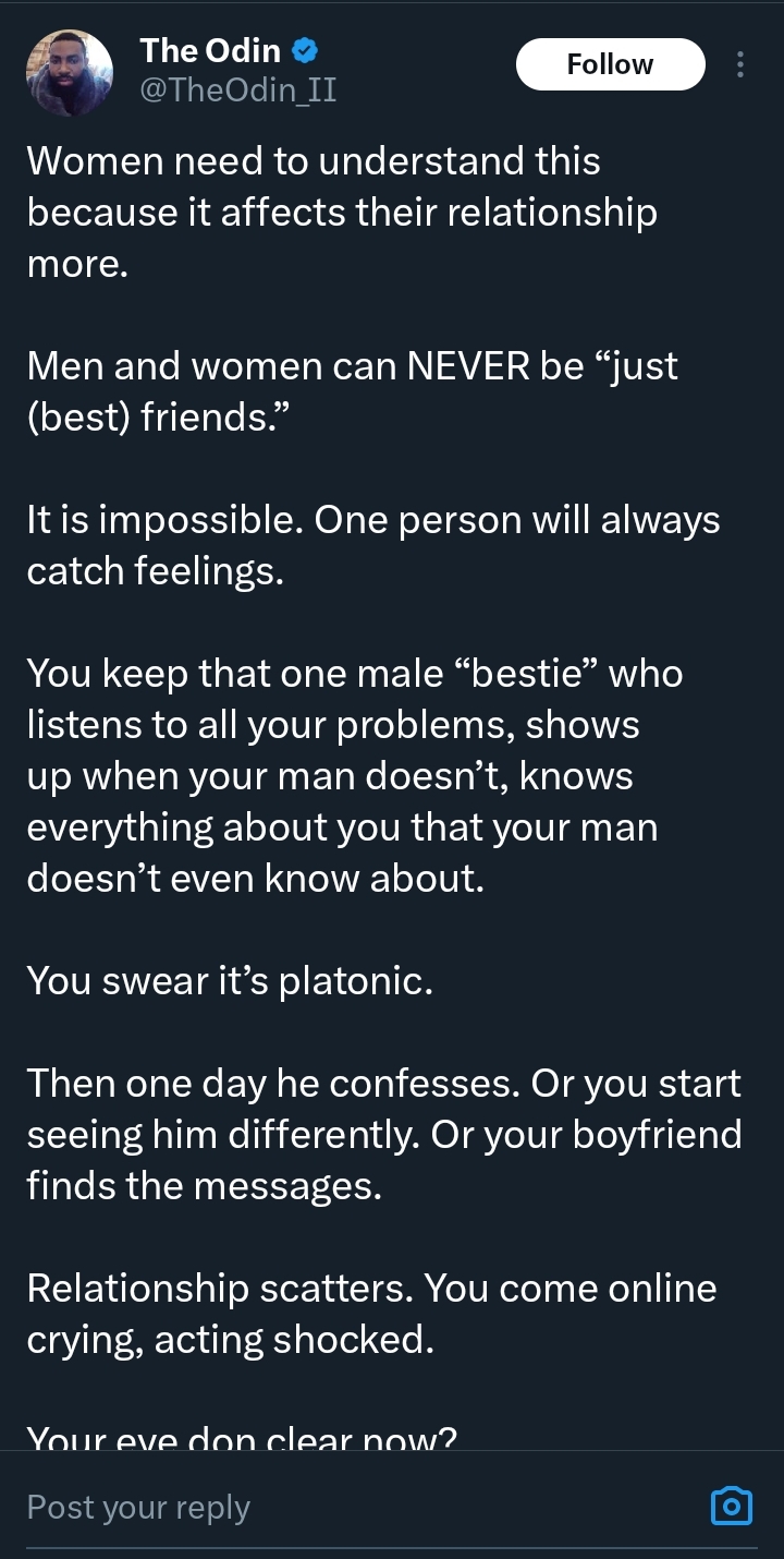 A social media post by a Nigerian man has triggered intense debate online after he argued that men and women cannot remain “just best friends” without emotional consequences.