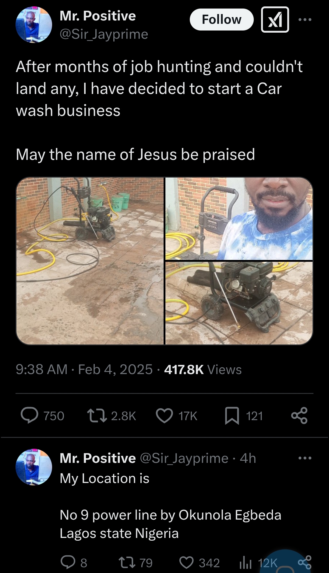 His message read: “After months of job hunting and not landing any, I have decided to start a car wash business. May the name of Jesus be praised.”