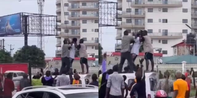 In a video posted on social media by influencer on the X platform, @Mbahdeyforyou, the young man is seen hanging from a rope which has been suspended from a bridge while he is standing on a white bus.