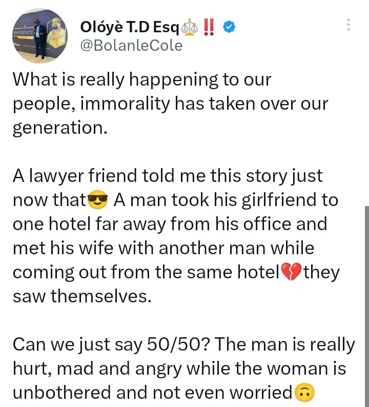 A lawyer friend told me this story just now that😎 A man took his girlfriend to one hotel far away from his office and met his wife with another man while coming out from the same hotel💔they saw themselves.