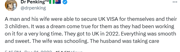 In the account of events shared by the Tweep, the man secured visa for his wife and 3 kids to move to the UK in 2021. They had begun living the UK dream, with everything moving well.