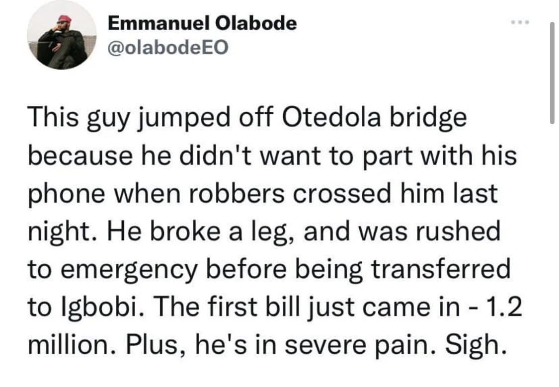 “This guy jumped off Otedola bridge because he didn’t want to part with his phone when robbers crossed him last night.
