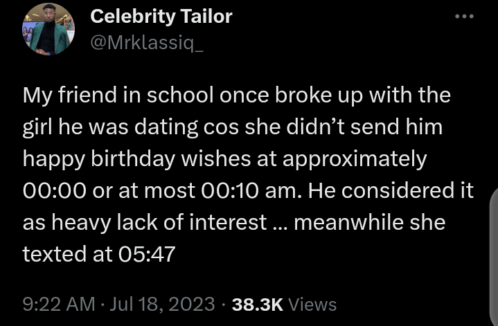 His statement “My friend in school once broke up with the girl he was dating cos she didn’t send him happy birthday wishes at approximately 00:00 or at most 00:10 am. He considered it as heavy lack of interest. Meanwhile she texted at 05:47.”