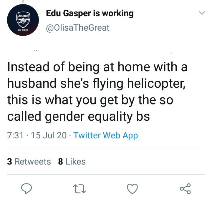 “Instead of being at home with a husband she’s flying helicopter, this is what you get by the so called gender equality bs.”, he wrote.