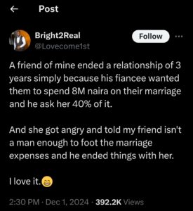 “A friend of mine ended a 3-year relationship because his fiancée wanted them to spend ₦8 million on their wedding.”