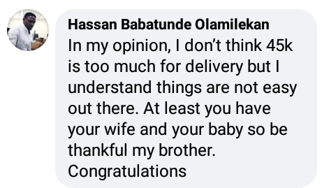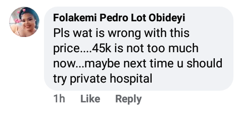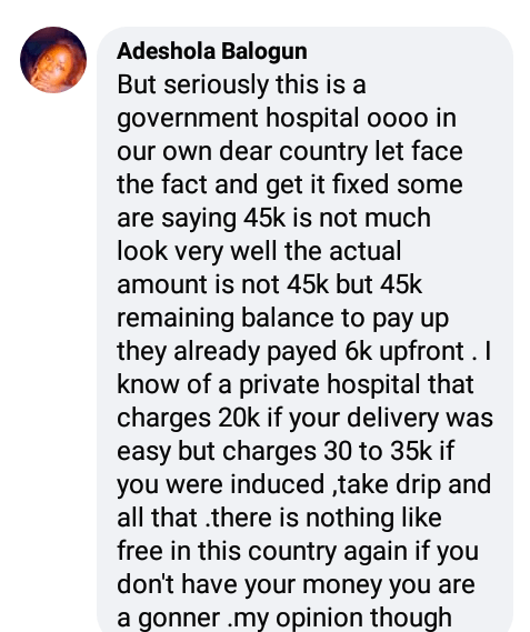 “No private hospital will give such a low bill for normal delivery. Go and do your fact findings. If you choose Iya alagbo. Yes to an extent but when complication arises, be ready for fiery outcome.”