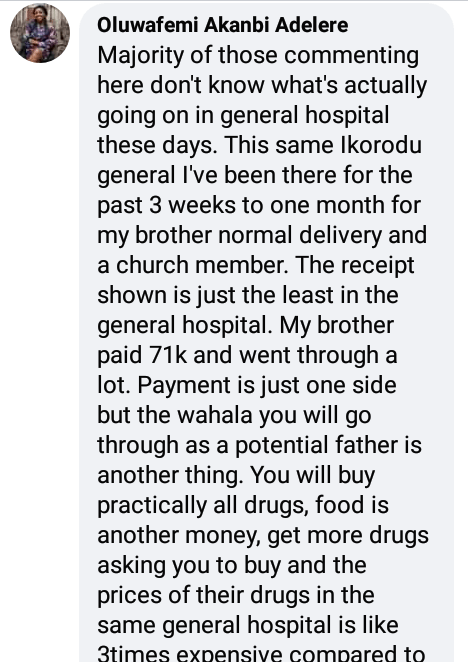 “Tragedy at our so called Genaral Hospital, how on Earth can a less than 1 hour labour and delivery successful without CS cost all this. Pls how much is private Hospital or even Iya Alagbo,” he wrote.
